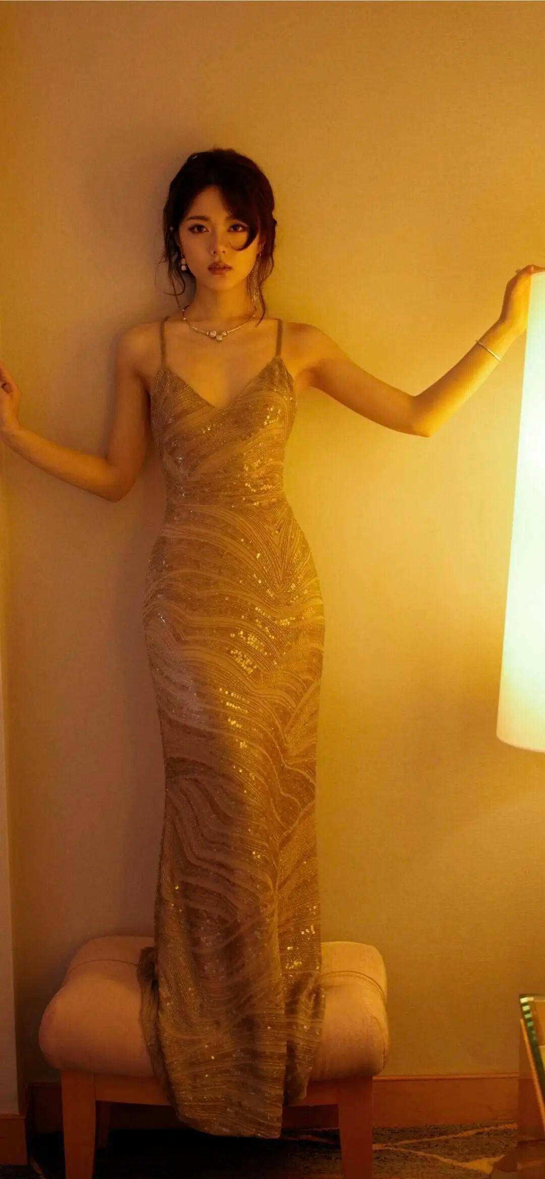 先说这吊带礼服的设计,低领吊带把她的肩颈线条全露出来了,咱就说那肌肤白得跟发光似的,在灯光下绝绝子!而且这礼服的亮片纹路还特显质感,把她的身材曲线勾勒得刚刚好,谁说扁平身材穿吊带不好看?赵今麦直接给玩明白了,这穿搭技巧我给满分!
