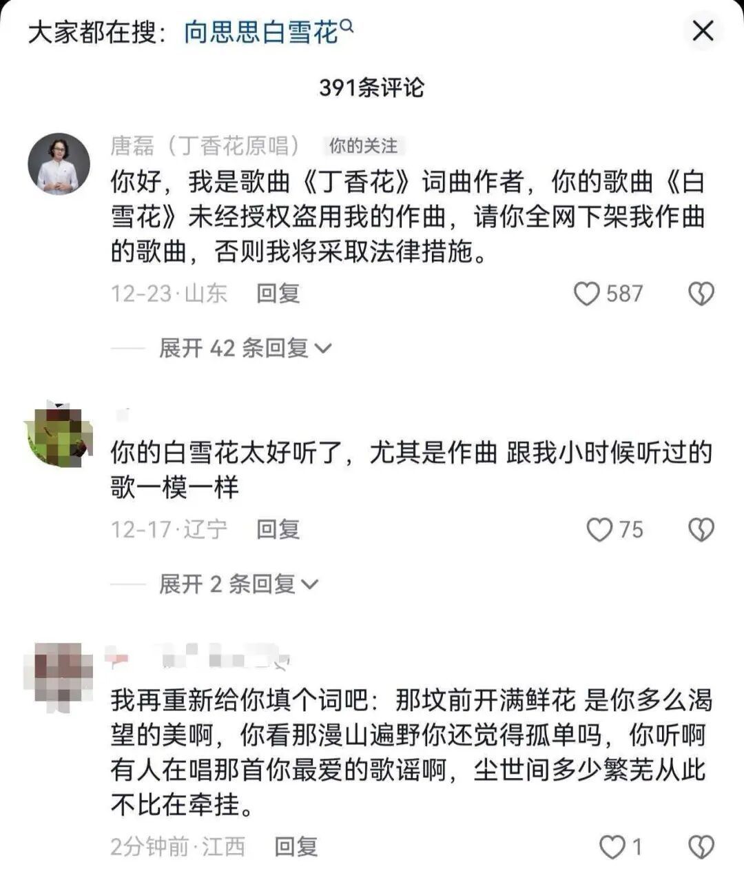 唐磊在视频中说,最近有很多网友在后台私信,说有一个名叫向思思的女歌手,唱了一首名叫《白雪花》的歌曲,用的是《丁香花》的作曲,相关的维权工作他已经在进行当中了,希望朋友们不要着急,也希望大家不要再网暴这个女歌手,到时候他会告诉大家维权的进展情况,谢谢大家!极目新闻记者注意到,在社交平台上,不少网友转发向思思演唱的《白雪花》视频,歌曲的旋律和20多年前由唐磊唱火的《丁香花》旋律一模一样,只是歌词不同。