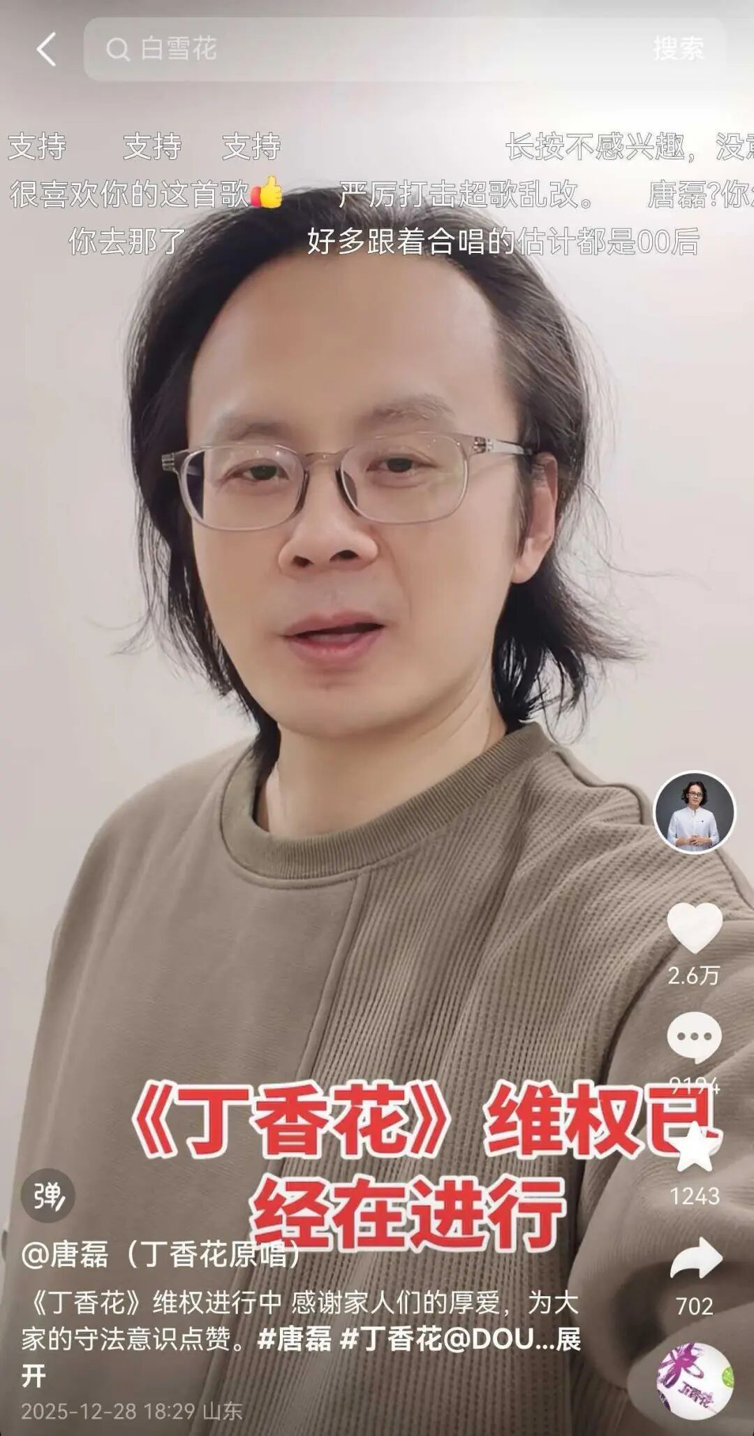 12月28日傍晚,丁香花原唱唐磊发视频说,《丁香花》维权进行中,感谢家人们的厚爱,为大家的守法意识点赞。